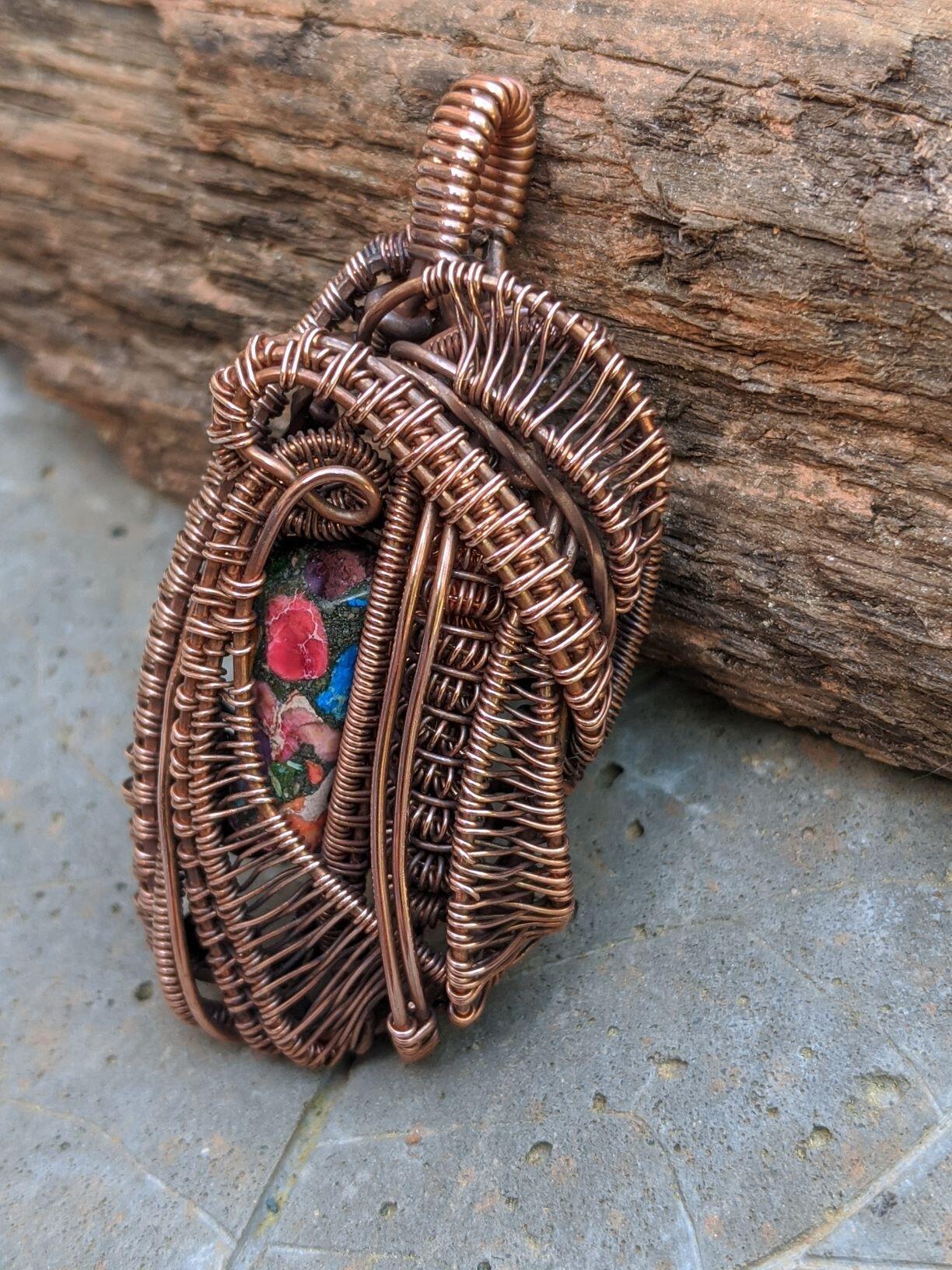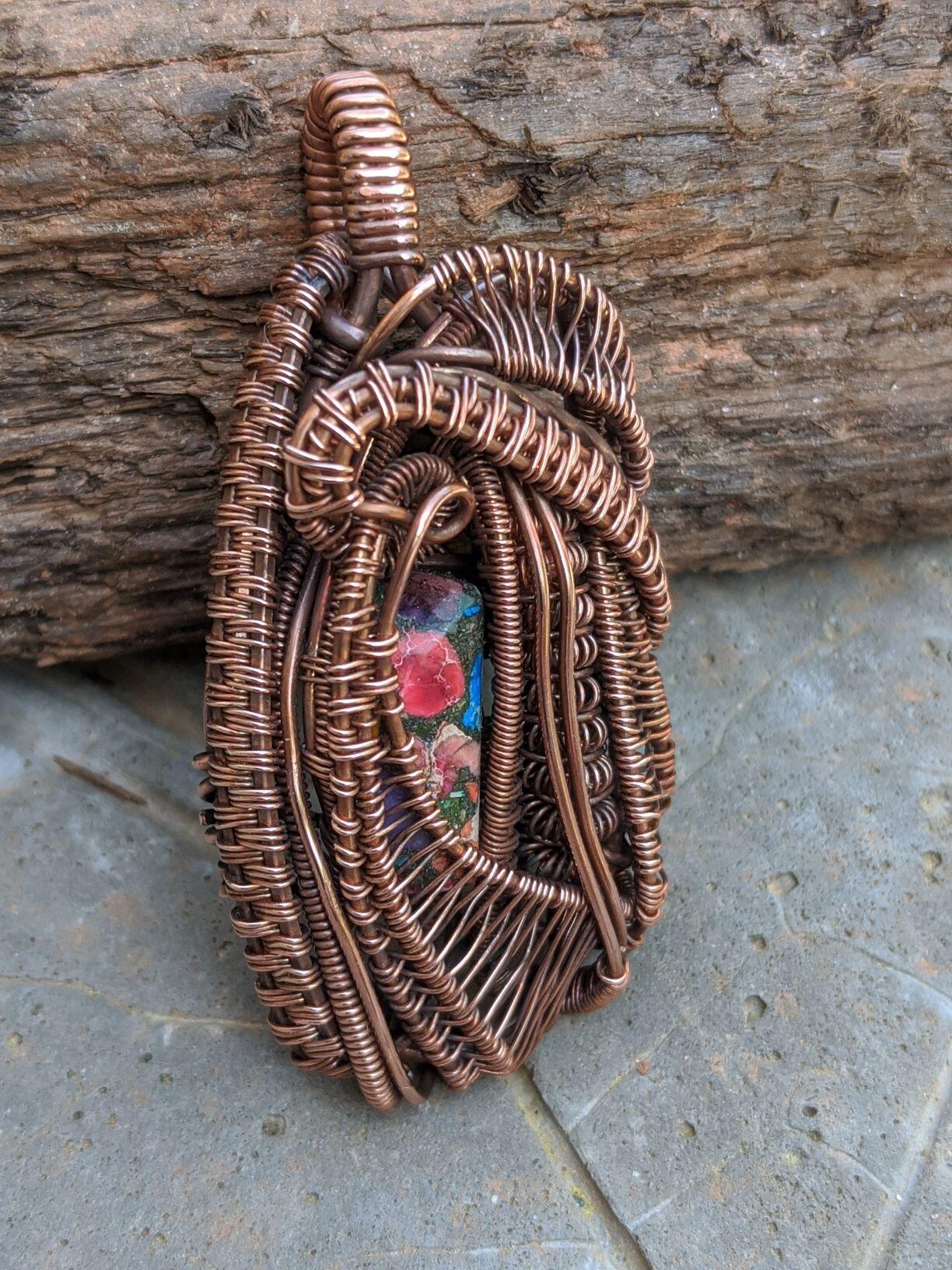 Multicolored composite stone in copper woven wire. This pendant is just a tad bit longer than 2" long and 1" wide and comes with a black satin cord. This is a one of kind handmade piece! The stone is just peaking out, offering a splash of color to the wire work.