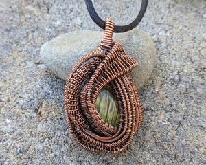 An intricate but delicate pendant featuring vibrant Carnelian and Rainbow Moonstone cabochons wrapped and woven in Copper wire. The Copper weaves around the stones, forming elegant patterns that enhance the natural beauty of the gemstones. The overall effect is one of warmth, luminosity and timeless elegance.